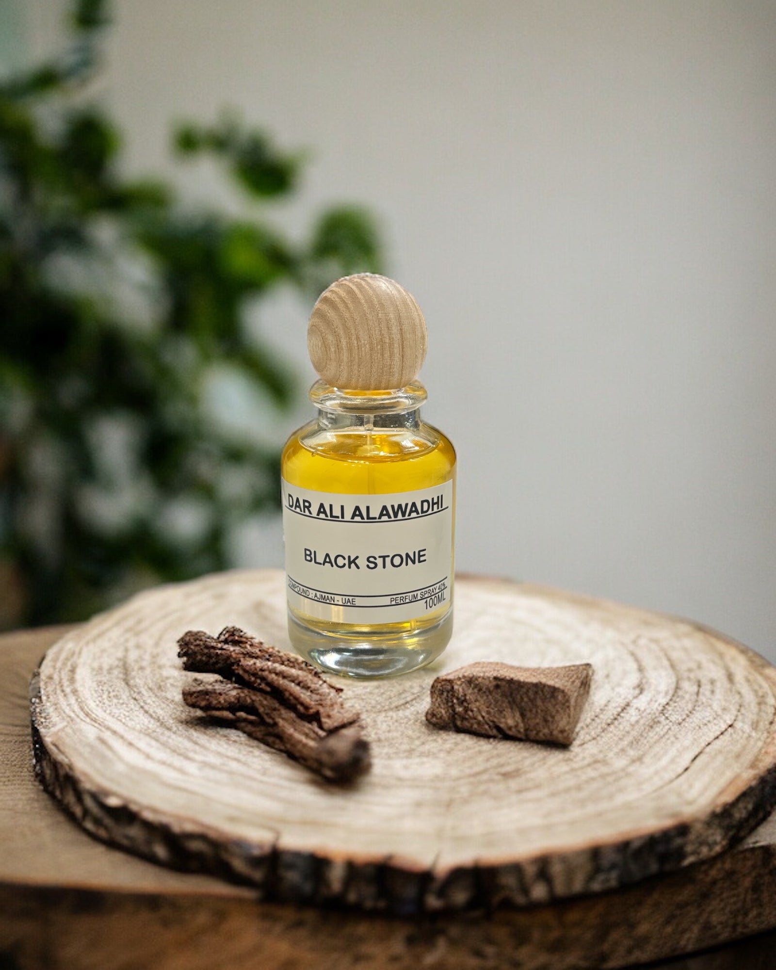 عطر للجنسين مستوحى من عطر بلاك ستون من عبدالصمد القرشي ، الافتتاحية: نوتة الورقيات الاخضراء والبرتقال، القلب: الورد، القاعدة: خشب الارز والمسك والصندل والعود